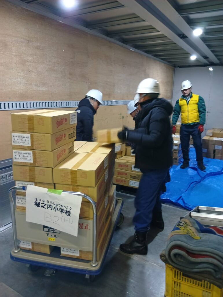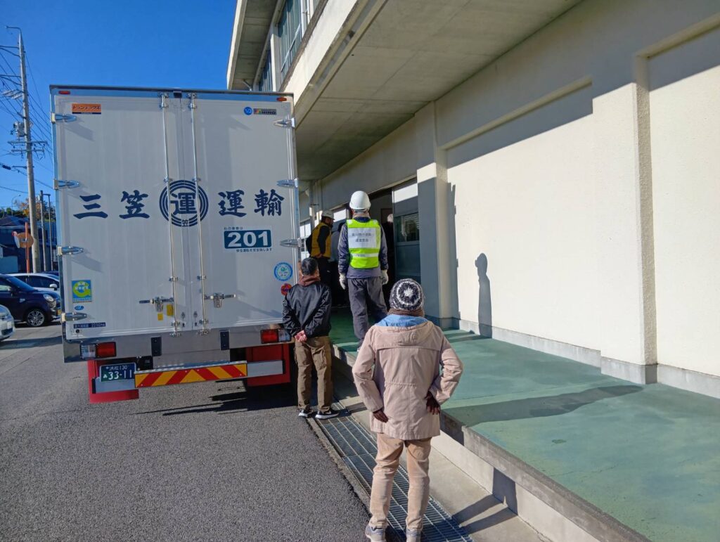 訓練内では各施設からバケツリレー方式で職員の方々と協力して積込、ルート配送といった流れで運搬・降ろし先では地域の方々が手降ろし協力してくださいました。